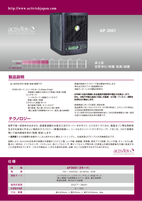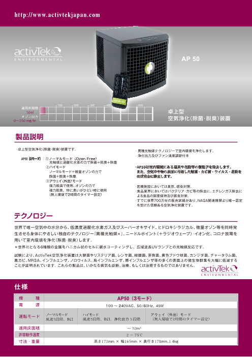 【製品説明】●卓上型空気浄化(除菌・脱臭)装置です。●異種光触媒テクノロジーで室内環境を浄化します。●浄化出力及びファン速度調節付き●AP50は室内環境にある悪臭や...