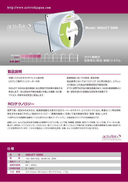 自然界の空気浄化プロセスを研究し実用化された、世界初のRCIテクノロジー異種光触媒屋内空間の菌やカビや臭いに直接アタック!室内にイオンが広がり有害粒子を分解します...