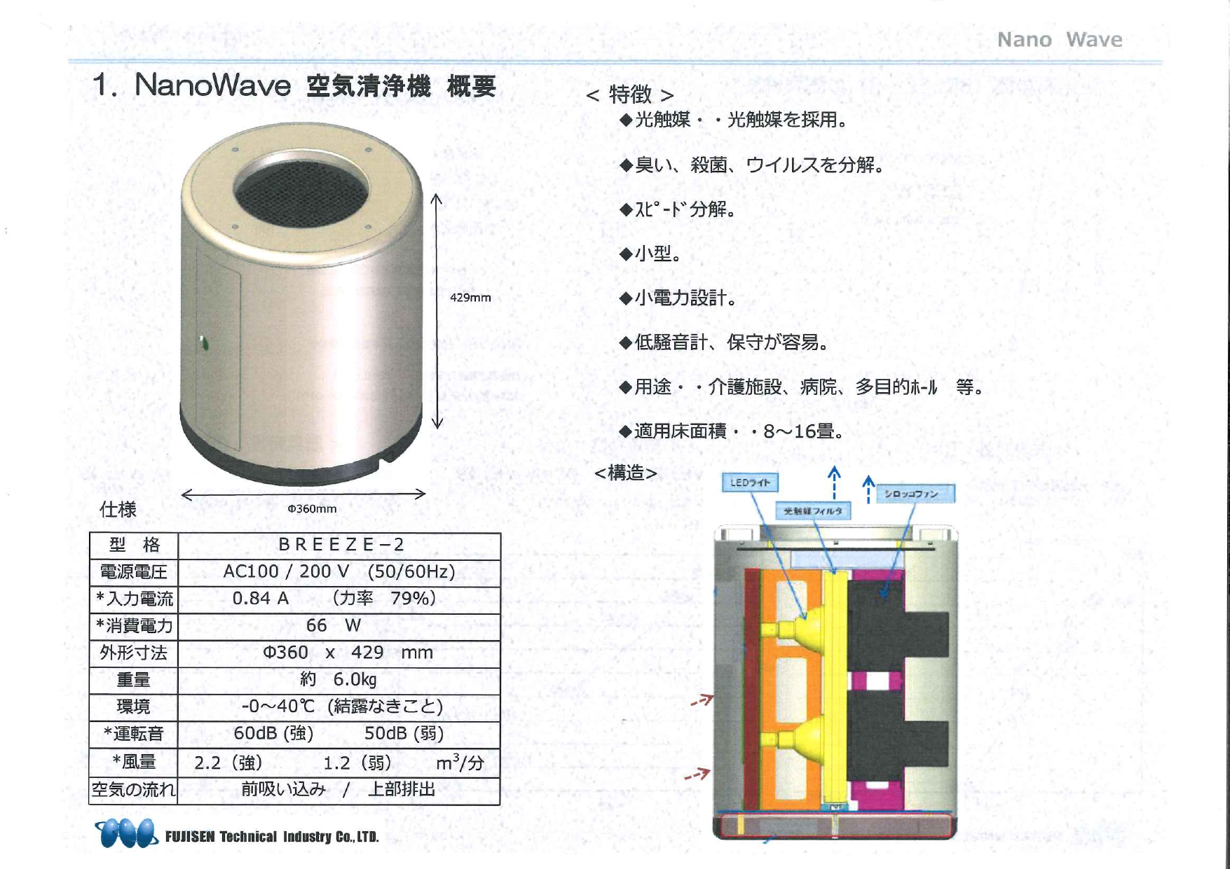 〈特徴〉◆光触媒・・光触媒を採用。◆臭い、殺菌、ウイルスを分解。◆スピード分解。◆小型。◆小電力設計。◆低騒音計、保守が容易。◆用途・・介護施設、病院、多目的...