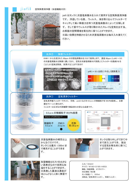 jiafil はタンクに次亜塩素酸水を入れて使用する空気除菌清浄器です。