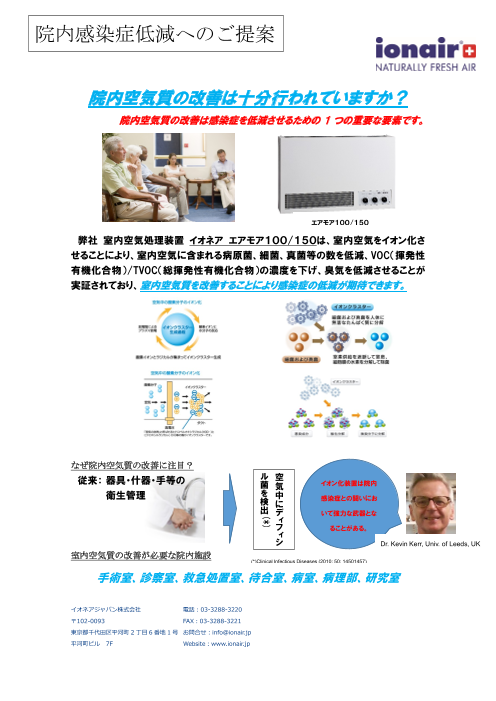 院内空気質の改善は感染症を低減させるための1つの重要な要素です。 室内空気処理装置 イオネア エアモア100/150は、室内空気をイオン化させることにより、室内空気に...