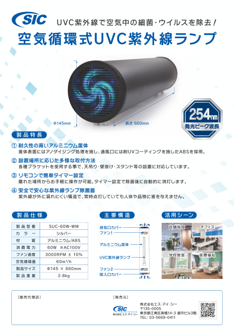 『SUC-60W-WM』は、UVC紫外線で空気中の細菌・ウイルスを除去する空気循環式UVC紫外線ランプです。筐体表面にはアノダイジング処理を施し、通風口には耐UVコーティングを...