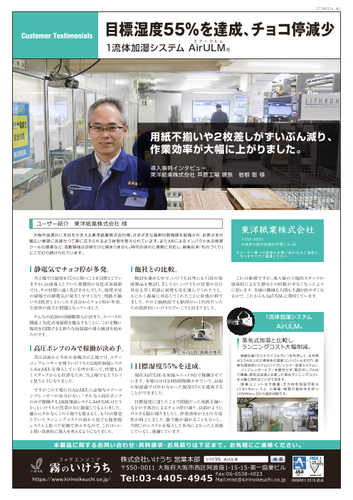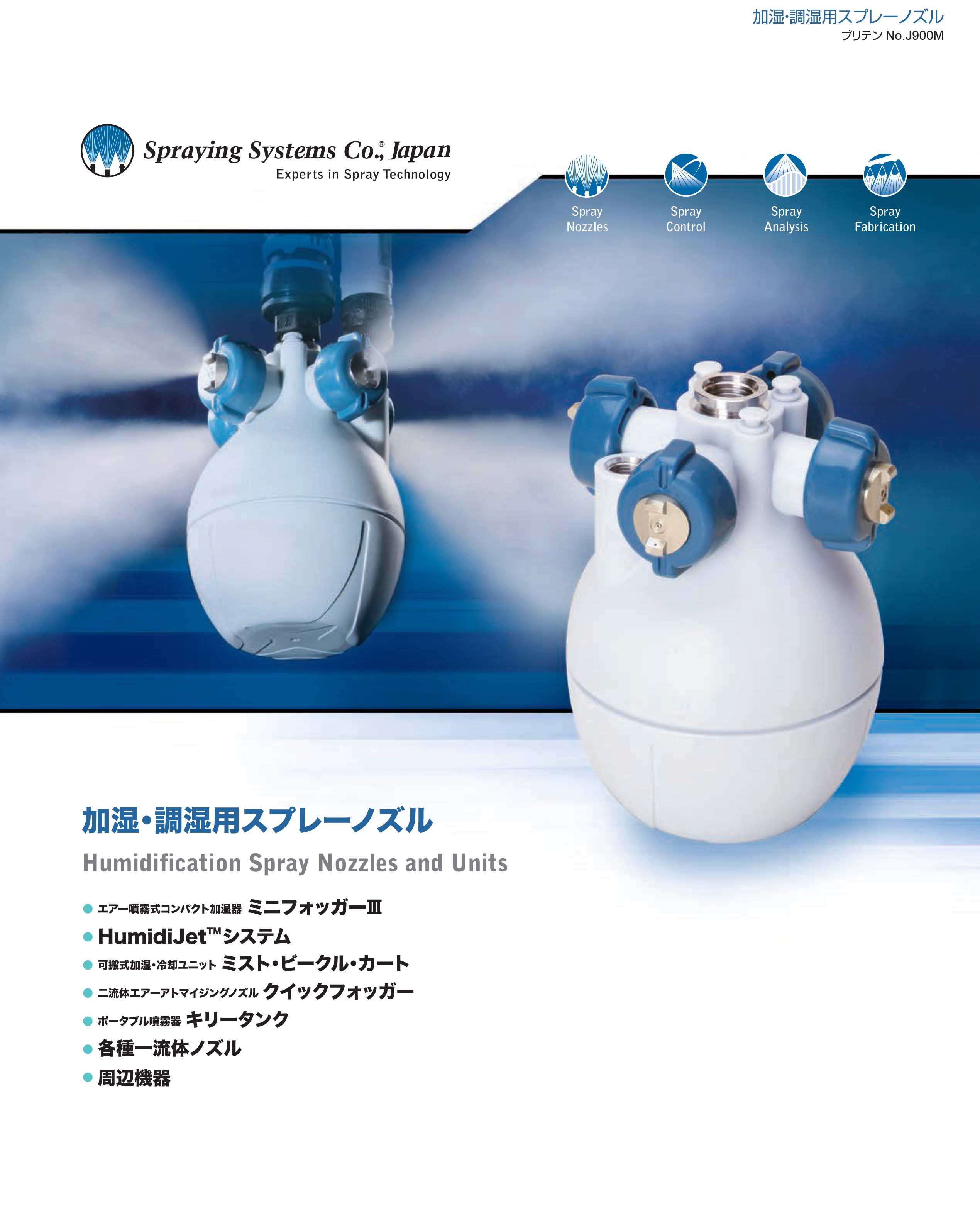 均一な微細粒子を噴霧するエアー式加湿器「ミニフォッガーⅢ」をベースとし、加湿用ノズルや可搬式の加湿ユニットなどをラインアップ。高い加湿能力で湿度調節、静電気防止、塵...