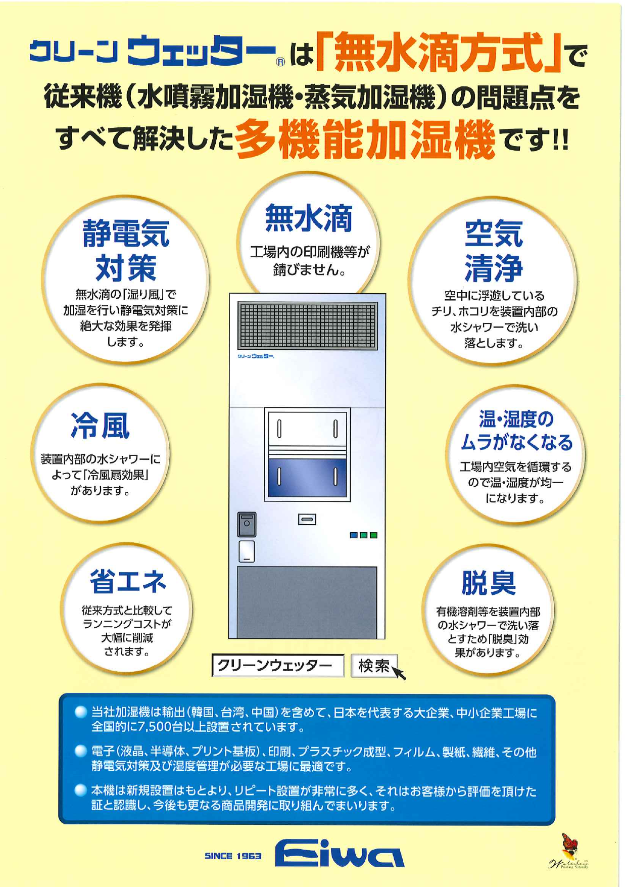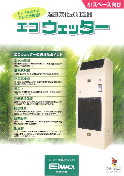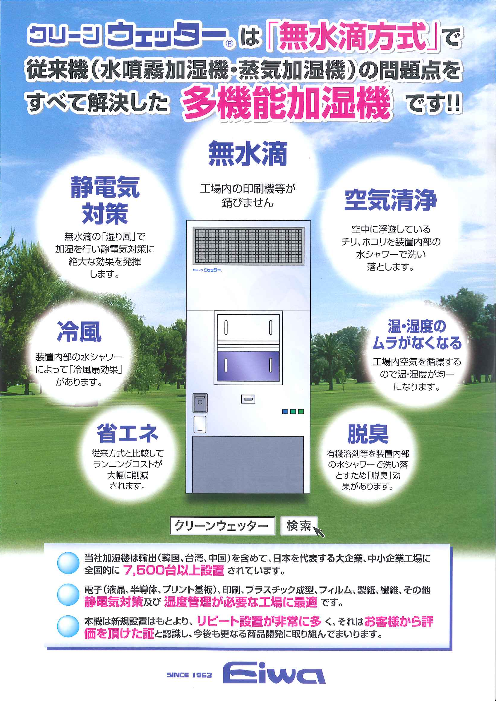 湿風気化式加湿器エコウェッターは、主に事務所の様な環境で使用されておりますが、粉塵等の発生が少ない環境であれば工場に設置することも可能です。○無水滴加湿○静電気...