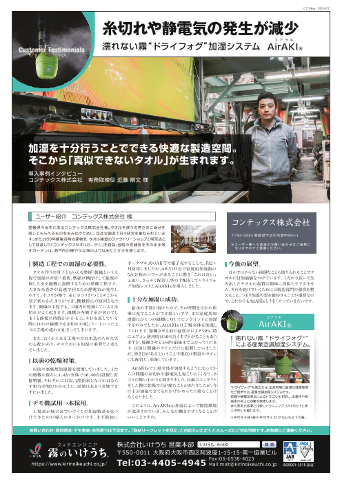 「AKIMist(R) "E"」は非常に微細な霧「ドライフォグ」を発生させ、湿度調整を行う産業用加湿器です。ドライフォグは別名”濡れない霧”と呼ばれ、粗大な粒子を含まないことで設...