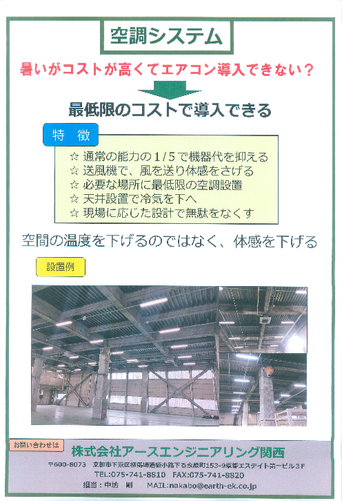 ・通常の能力の1/5で機器代を抑える・送風機で、風を送り体感をさげる・必要な場所に最低限の空調設置・天井設置で冷気を下へ・現場に応じた設計で無駄をなくす◆詳...