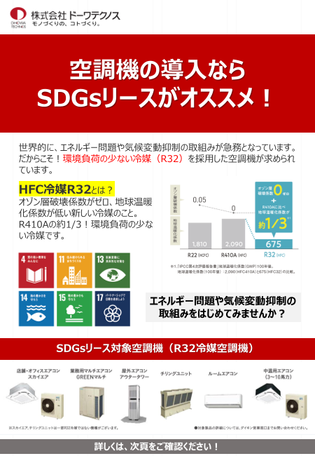 世界的に、エネルギー問題や気候変動抑制の取組みが急務となっています。だからこそ!環境負荷の少ない冷媒(R32)を採用した空調機が求められています。さらに!SDGsリース...