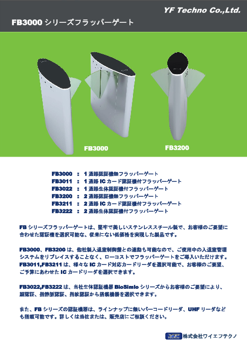 FB シリーズフラッパーゲートは、堅牢で美しいステンレススチール製で、お客様のご要望に合わせた認証機を選択可能な、従来にない低価格を実現した製品です。【掲載内容】...