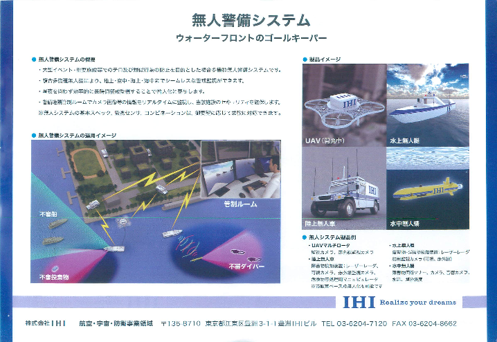 大型イベント・重要施設等でのテロ及び類似行為の防止を目的とした複合多機種無人警備システムです。複合多機種無人機により、地上・空中・海上・海中までしーむレスな警戒監...