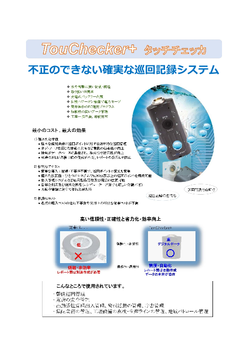 巡回経路にiButtonを設置しチェッカーでタッチを行うことにより、巡回記録管理を行います。巡回記録はPCに取り込み、保存、巡回記録の閲覧を行えます。従来の巡回時計とは違...