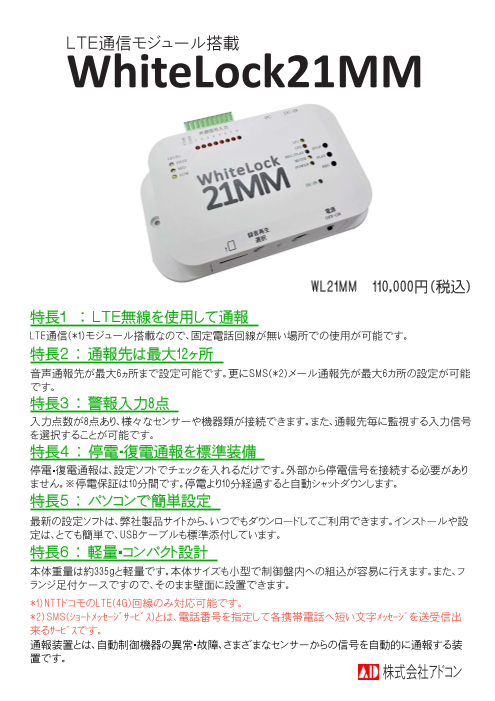◆LET無線(NTTドコモ回線)を使用して通報◆通報先は最大12ヶ所(音声通報6か所とSMS通報6か所)◆警報入力8点◆停電・復電通報を標準装備◆パソコンで簡単設定◆軽量・コ...