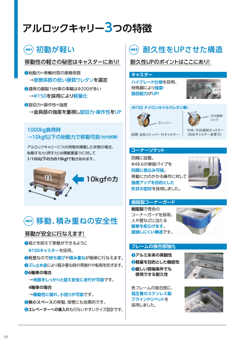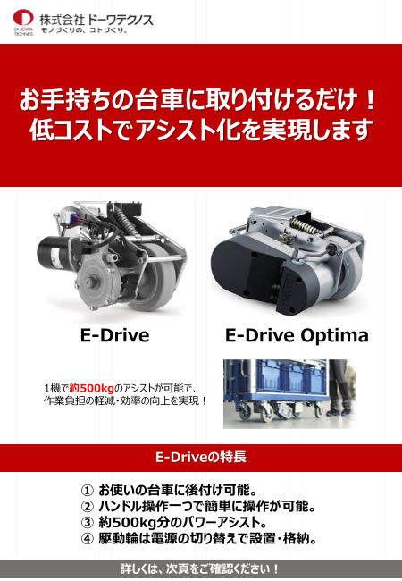 お手持ちの台車に取り付けることで、アシスト化を実現します。負荷の高い重量物用台車の手押し作業も、E-Driveなら手元操作で簡単に操作可能に。最大総重量1,000kgの補助対...