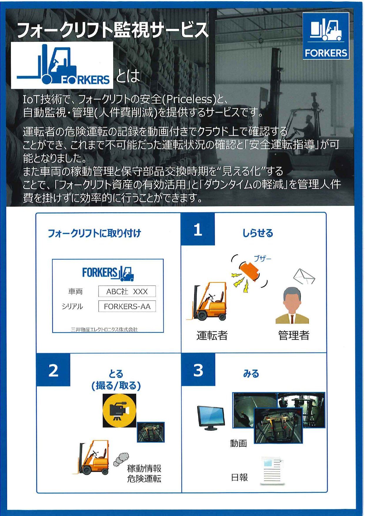 フォークリフト監視サービス の 三井物産エレクトロニクス カタログのご案内です。