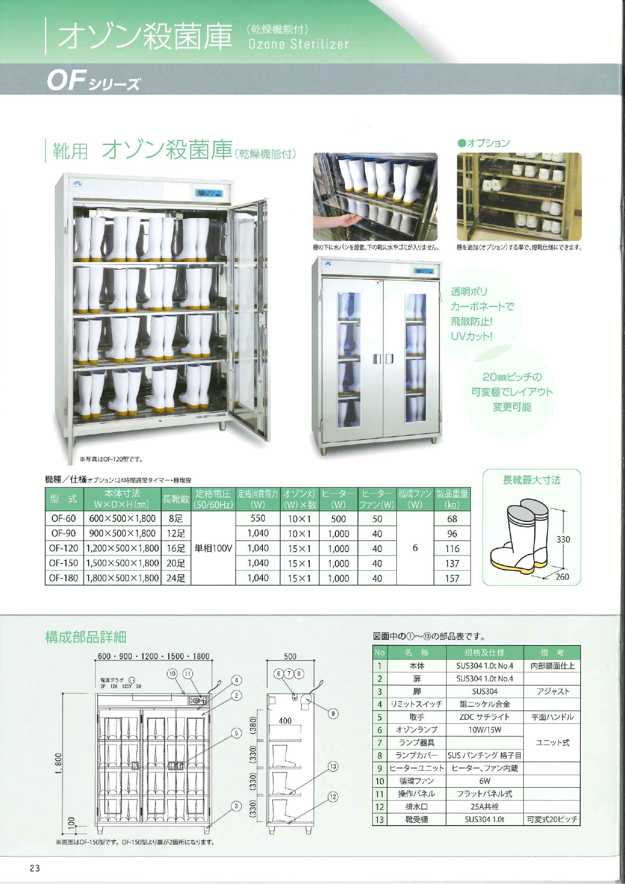 靴用 オゾン殺菌庫(乾燥機能付)・透明ポリカーボネートで飛散防止!UVカット!・20mmピッチの可変棚でレイアウト変更可能