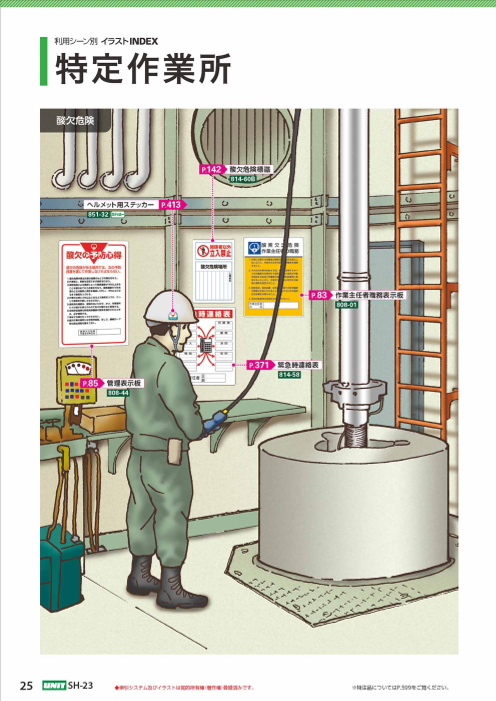 ユニット総合カタログの利用シーン別イラストINDEXです。掲載内容◆酸欠危険◆騒音管理区分◆特定化学物質◆有機溶剤◆有害物質◆粉じん など◆詳細はカタログを...
