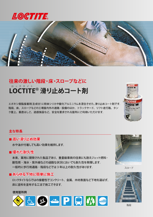 エポキシ樹脂接着剤(主成分)に粉末シリカや酸化アルミニウムを混合させた、滑り止めコート剤です。◆高い滑り止め効果水や油が付着しても高い効果を維持します。◆...