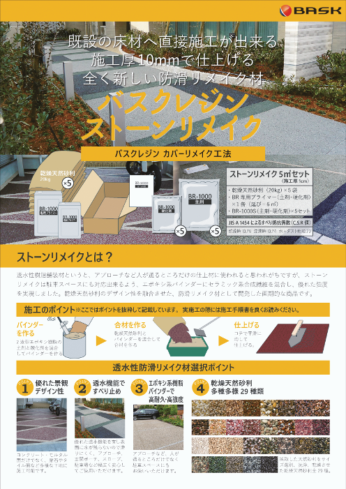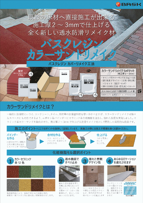 一般的に防滑材というと、コンクリート、タイル、石材などの防滑塗料材を思い浮かべますが、カラーサンドリメイクは様々なスペースにも対応できるよう、エポキシ系バインダーに...