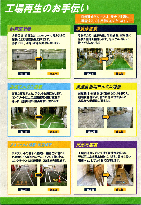 【掲載内容】◆防塵床塗装◆厚膜床塗装◆樹脂モルタル舗装◆高強度樹脂モルタル舗装◆アスファルト補修・段差修正◆天然石舗装◆詳細はカタログをダウンロードしてご...