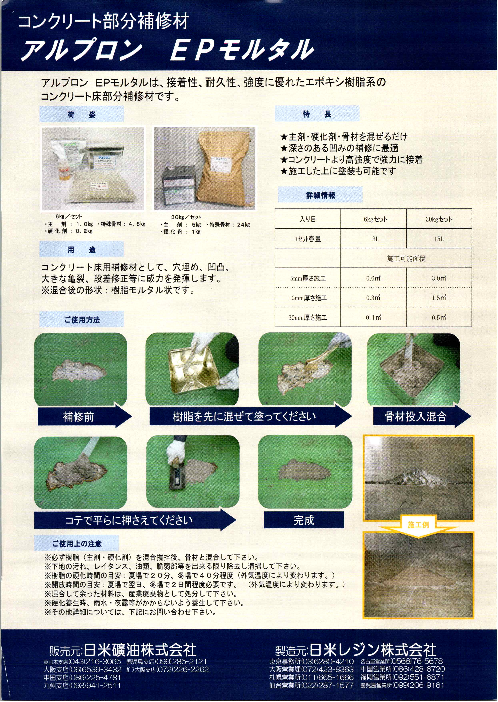 接着性、耐久性、強度に優れたエポキシ樹指系のコンクリート床部分補修材です。
