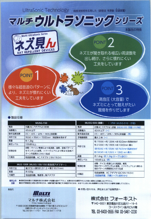 様々な超音波のぱたーんにより、ネズミが慣れにくい工夫をしています。ネズミが聞き取れる幅広い周波数を出し続け、さらに慣れにくい工夫をしています。高音圧(大音量)で...