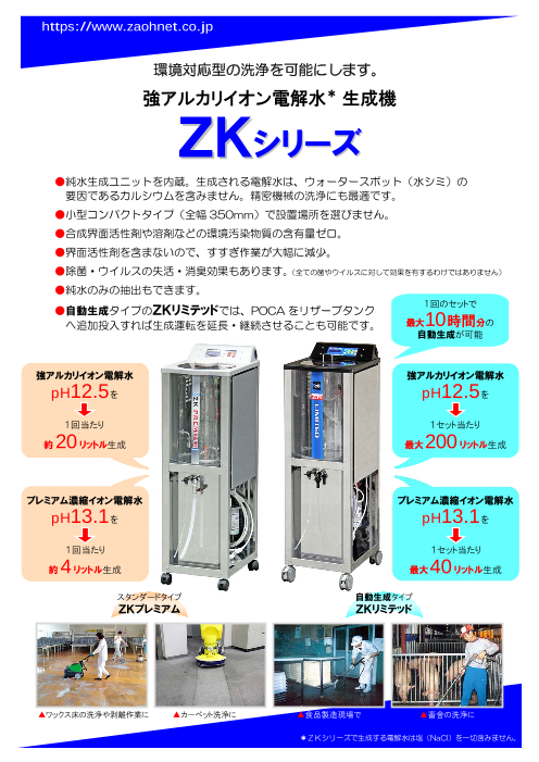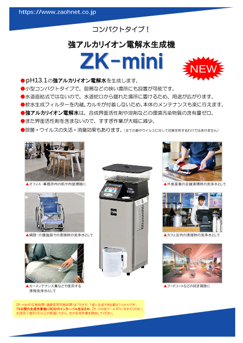 ●pH13.1の強アルカリイオン電解水を生成します。●小型コンパクトタイプで、厨房などの狭い場所にも設置が可能です。●水道直結式ではないので、水道蛇口から離れた場所に置け...