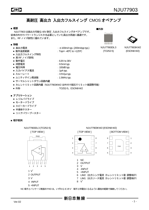 NJU77903は高出力可能な40V耐圧入出力フルスイングオペアンプです。