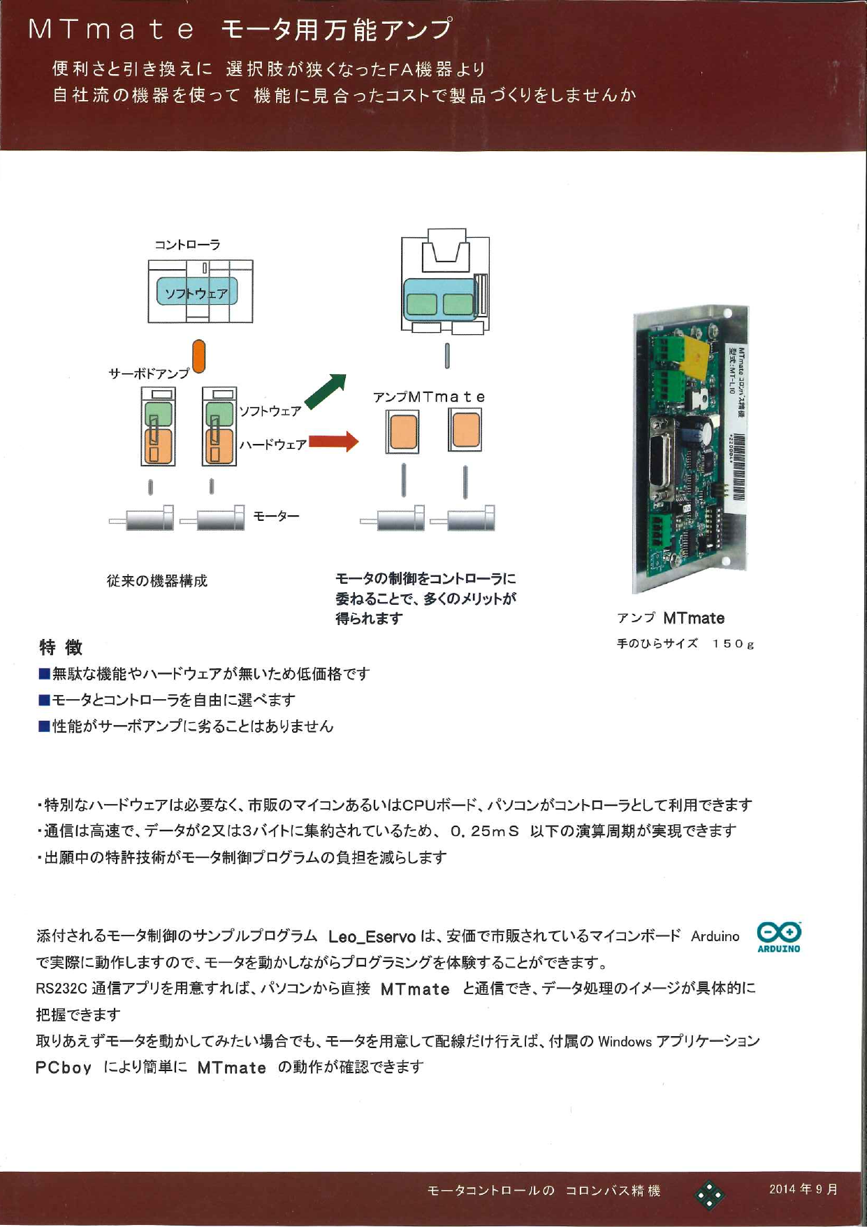 MTmateはモータのコントロールに必要な機能だけを備えたシンプルなモータドライバです。DCモータはもちろん、ブラシのないDCブラシレスモータやFA用のサーボモータもコントロー...