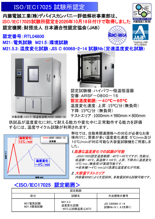 【認定項目】 電気試験/環境試験:温度変化試験(JIS C 60068-2-14)弊社では、自動車関連規格への対応が必要なお客 様向けに、需要が多い温度変化速度:5°C/min及び 10...