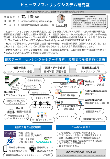 ヒューマノフィリックシステム研究室は、2019年4月に九州大学・大学院システム情報科学研究院・情報知能工学部門に発足した新しい研究室です。実世界からのセンシング技術とクラ...