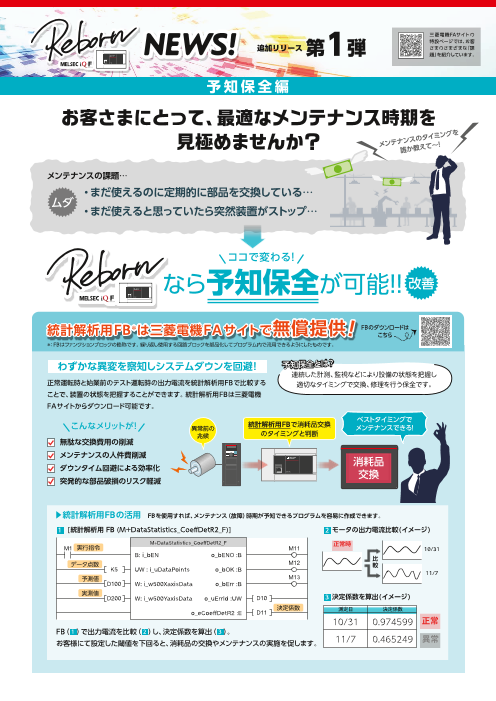 わずかな異変を察知しシステムダウンを回避 !正常運転時と始業前のテスト運転時の出力電流を統計解析用 FB で比較することで、装置の状態を把握することができ...