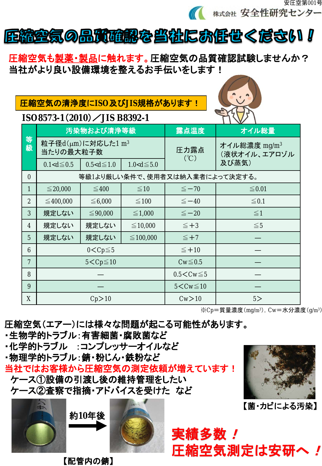 【実績多数】圧縮空気の品質確認を当社にお任せください!圧縮空気も製薬・製品に触れます。トラブルの前に品質確認をしませんか?圧縮空気(以下、圧空)の清浄度にISO、JIS規格があります!『圧空も製薬や製品に触れます』圧空には、様々なトラブルの要因...