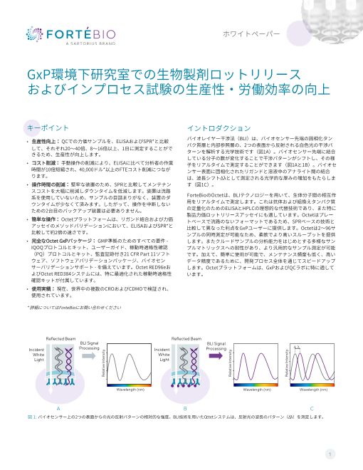 ■生産性向上: QCでの力価サンプルを、ELISAおよびSPR*と比較して、それぞれ20~40倍、8~16倍以上、1日に測定することができるため、生産性が向上します。■コスト削減: 手...
