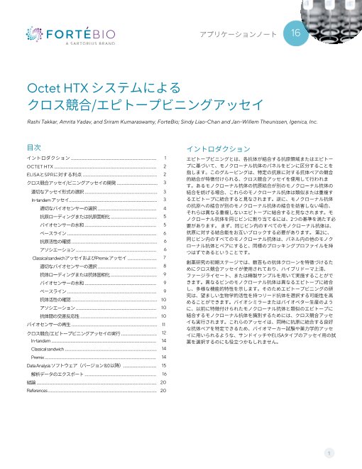 目次イントロダクションOCTET HTXELISAとSPRに対する利点クロス競合アッセイ/ビニングアッセイの開発適切なアッセイ形式の選択In-tandem アッセイ適切なバイオセ...