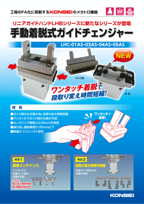 ■ガイド部のみ交換の為、段取り変え時間短縮■ワンタッチでガイド部の交換が可能■センタリング精度±0.05mmを実現■繰り返し着脱精度0.05mm以下■軽量かつコンパクト設計...