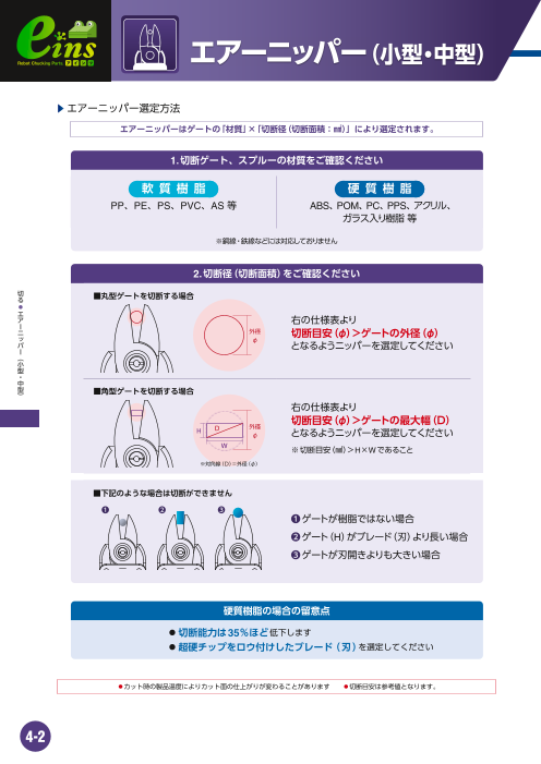 エアーニッパーはゲートの「材質」×「切断径(切断面積:㎟)」により選定されます。