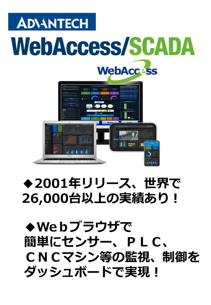 【WebAccessについて】・2001年の初版リリースから20年以上、世界で26,000台以上の導入実績・Web ブラウザから簡単にセンサー、PLC、CNCマシンなどを監視・制御を実現・...