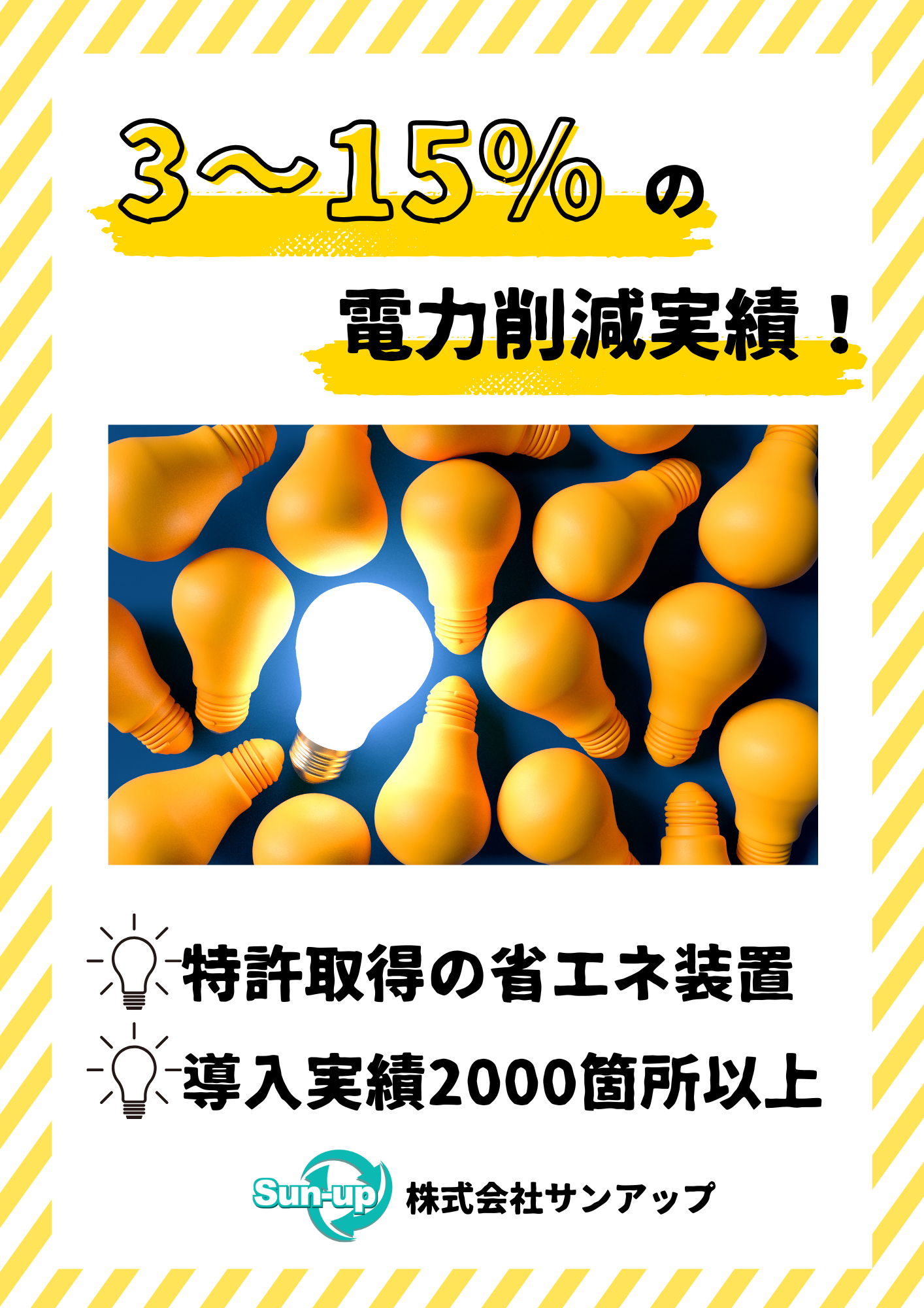 ◆3〜15%の電力削減実績電⼒使⽤量3〜15%の削減効果が⾒込めます(導⼊平均実績7%)。3〜5年程度で投資回収が可能です◆特許取得製品「電⼒改善装置」の名称で、特許取得済...