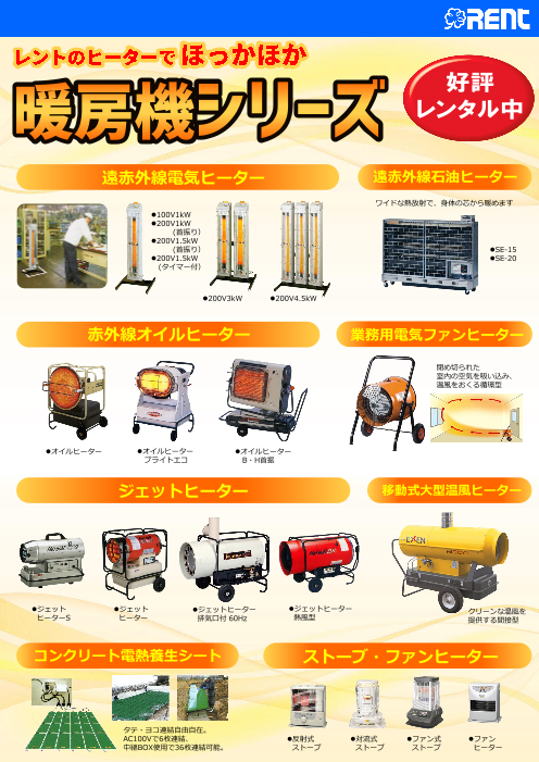 レントでは、暖房機器のレンタルをおこなっております。限定された期間で使用するものだからこそ、必要期間や用途に合わせて選べるレンタルが最適です。厳しい寒さに備えるラ...