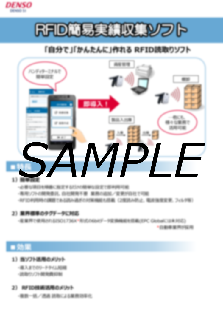 当ソフトは、RFID読取設定の追加/変更が自社でできるため、導入までのリードタイム短縮や開発費をおさえることができます。■特長1)ハンディターミナルで簡単設定2)...