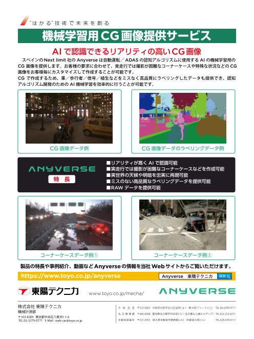 Anyverseは、AD(自動運転)/ADASの認知アルゴリズムに使用するAI(人工知能)の機械学習用のCG画像を提供するサービスです。お客様の要求に合わせて、実走行では撮影が困難なコ...