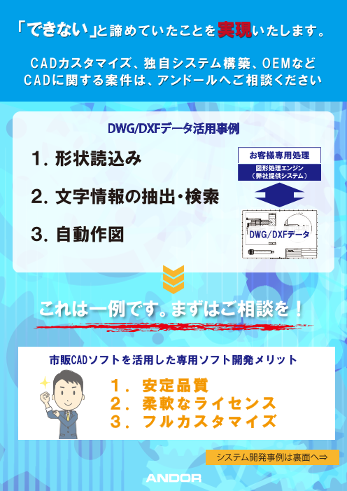 当社では『2D/3DCAD資産を活用したシステム開発』を行っております。CADのカスタマイズ、独自システム構築、OEMなど幅広く対応可能。市販CADソフトをベースにお客様専用の...