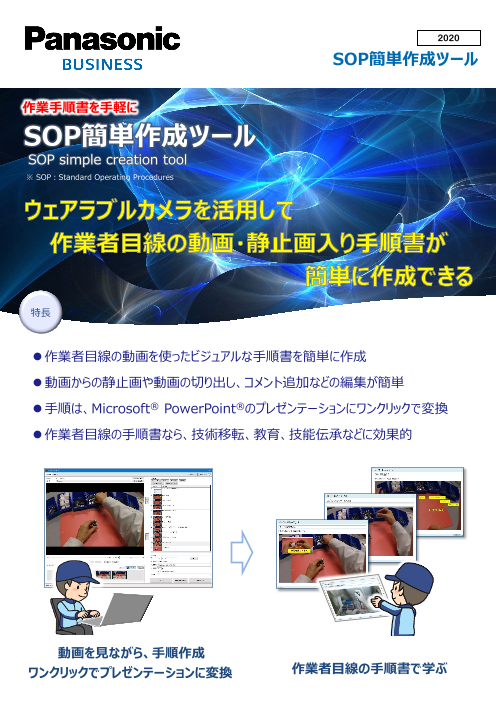 効果• 3ステップで 作業者目線の ビジュアルな手順書が作成 できる• 作業者目線で、 作業のチェックポイントやコツを効果的に ガイダンス• 通常作業をしながら 、ウェア...