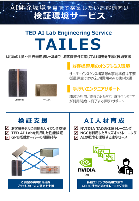 東京エレクトロンデバイスでは、AI開発環境を自前で構築したいお客様向け検証環境サービス(TAILES)を提供し、AI開発におけるはじめの1歩~世界最速級レベルまで、お客様要件...