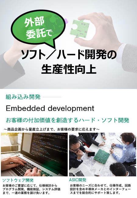 ◆組み込み開発 1) ソフトウェア開発 2) ハードウェア開発(デジタル/アナログ/ASIC/FPGA)◆プログラマブルIP(DRP)技術の提供 1) DRP (Dynamically Reconfigurabl...