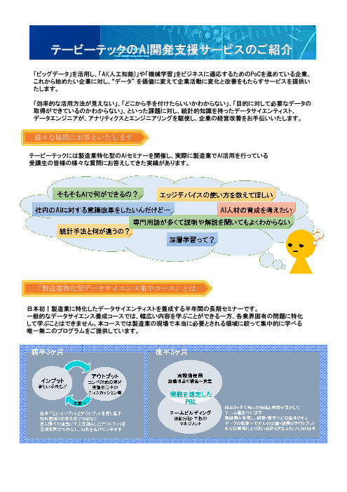 「ビッグデータ」を活用し、「AI(人工知能)」や「機械学習」をビジネスに適応するためのPoCを進めている企業、これから始めたい企業に対し、“データ”を価値に変えて企業活動に変...