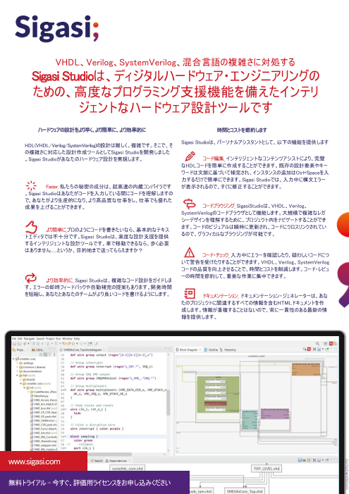 Sigasi Studioは、ディジタルハードウェア・エンジニアリングのための、高度なプログラミング支援機能を備えたインテリジェントなハードウェア設計ツールて...