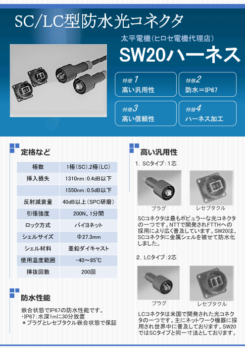 ヒロセ電機製防水光コネクタ「SW20シリーズ」と専用ケーブルを組み合わせた「SW20ハ...