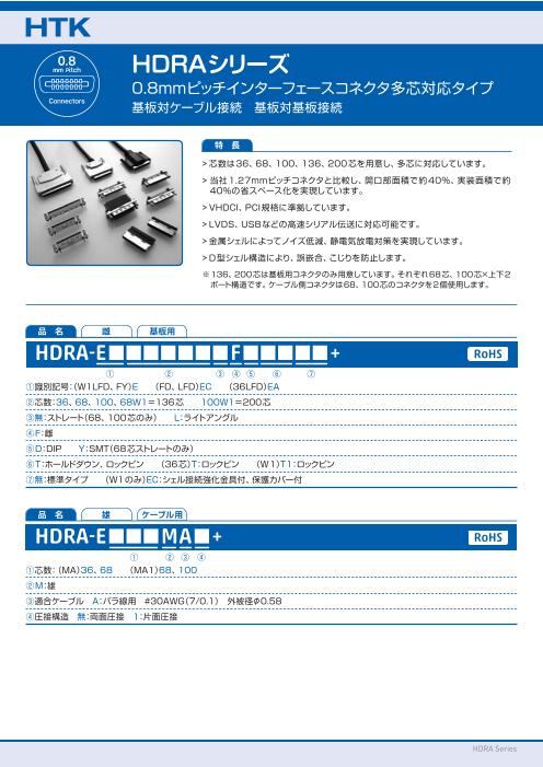 「HDRAシリーズ」は、金属シェルによってノイズ低減、静電気放電対策を実現している0.8mmピッチインターフェースコネクタ多芯対応タイプです。芯数は36、68、100、136、20...
