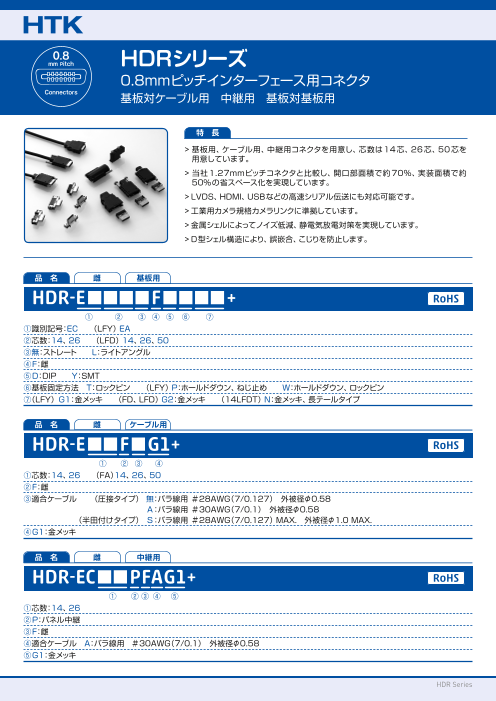 「HDRシリーズ」は、小型で堅牢性に優れ、芯数をはじめ品揃え豊富な、0.8mmピッチインターフェース用コネクタです。5,000回の長寿命設計で、LVDS信号等、高速伝送に対応して...