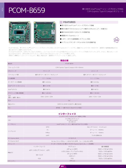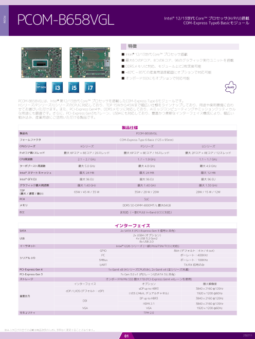 PCOM-B659は、第13世代 Intel® Core™ シリーズプロセッサに対応したCOM-Expressモジュールです。搭載CPUにより15W~28WのTDP、産業向け温度範囲製品も用途に合わせてご選択いた...